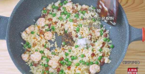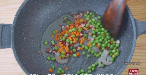 炒饭要香,油不能少,把虾仁、腊肠、胡萝卜和绿豌豆一股脑倒进去,炒香炒熟。