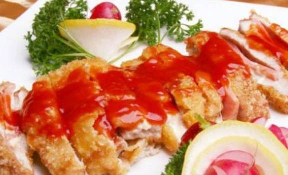 材料:鸡胸脯肉一块,鸡蛋一个淀粉适量,面包糠适量,油400克(实耗20克)盐适量,料酒十几滴,葱两片,姜一片,番茄酱适量