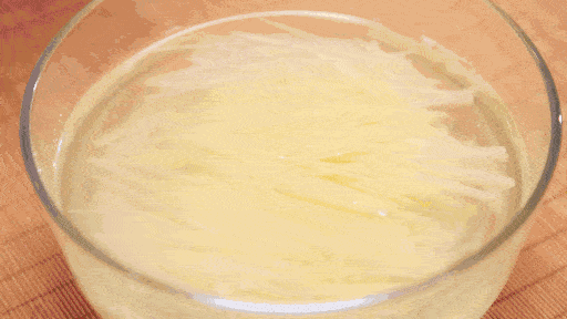 所以,在炒土豆丝之前,最好用 清水将里面的淀粉泡掉。主要目的是泡出土豆丝中的大部分淀粉质,这样炒出的土豆丝才会脆爽。