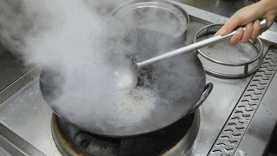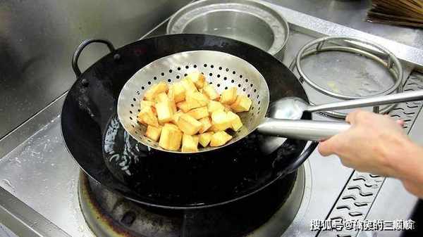 食材全部准备好以后,我们锅内烧油先把红薯丁炸一下。在烧油的过程中,我们可以用红薯试一下温度。当油温大致达到150度时,红薯的周围会产生很多的密集气泡,这时候红薯丁就可以依次下锅了。