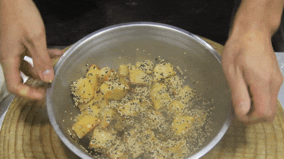 等红薯丁充分的裹上糖浆之后,趁热倒入装有芝麻的盆中。糖浆的黏性会让红薯丁沾满芝麻。颠盆拌匀之后,这道麻脸红薯就可以出锅装盘了。