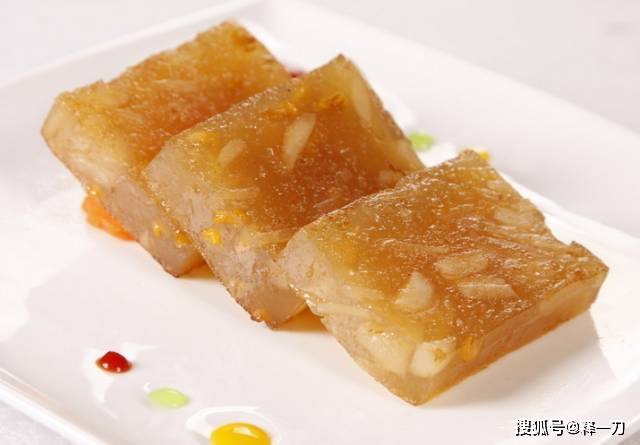 马蹄糕是济南的传统小吃之一,制作方法是将糯米粉和马蹄粉混合在一起,加入适量的水,搅拌均匀后蒸熟。熟后切成小块,再放在烤架上烤至金黄色,撒上芝麻和辣椒面即可。