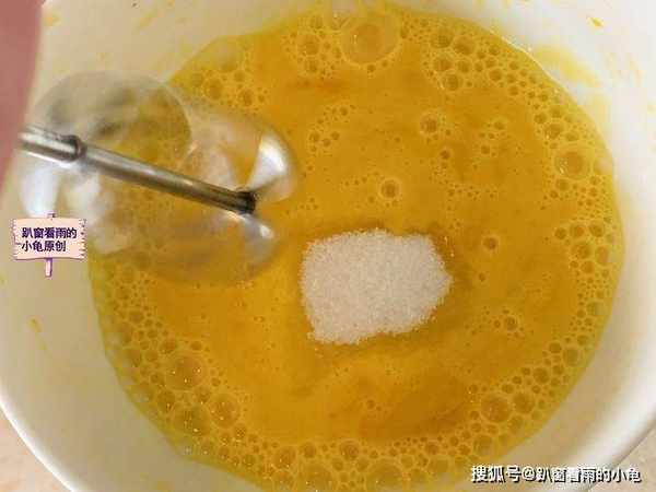 2:电动打蛋器高速打发,将蛋液打发至起泡,加入20克白砂糖;然后再继续打发,出现小细泡时,再加入20克白砂糖;再继续打发至细泡快消失时再加入20克白砂糖。[此步注意:60克白砂糖分三次放入。]在打发的过程中,可以看到蛋液的颜色由黄色逐渐变成乳黄色(近乳白色),而泡沫从丰富、粗糙变成细腻、直到消失。