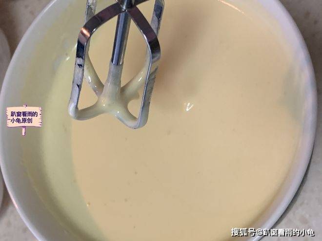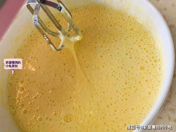2、全蛋液的打发时间会比蛋白打发时间要长,我用了电动打蛋器打了差不多15分钟左右。