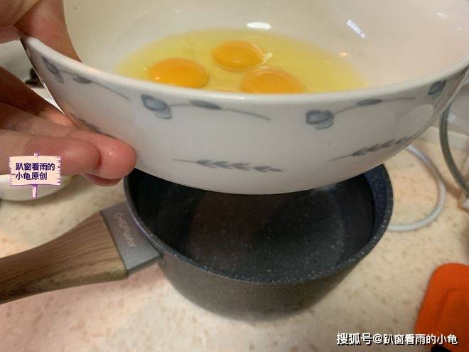 1:先在火上坐一锅热水,水不用太热,50度左右、用手摸起来能感觉比较热就可以了;然后将大碗坐于水中,将4个鸡蛋打入碗中,再加入几滴白醋去除鸡蛋的腥味。