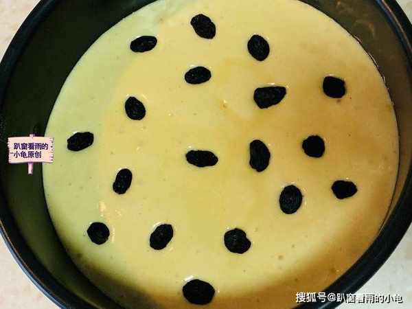 6:将蛋糕糊倒入模具中,然后在表面再摆上几颗葡萄干。放入提前预热好的烤箱中,上下火170℃烤30分钟左右即可。