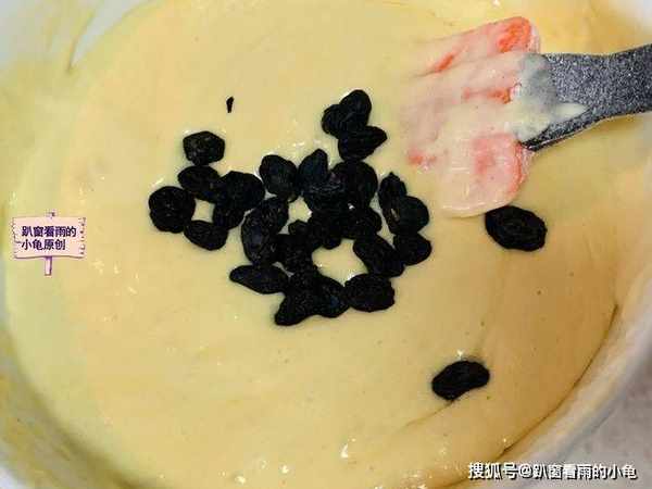 4、为了防止蛋糕在吃起来可能会有些许的腥味或者其他异味,可以在蛋液中加入几滴白醋去除腥味;油尽量用淡色淡味的,比如玉米油、大豆油、橄榄油等。为了增加口感,可以加入适量的葡萄干、蔓越莓干等,也可以不加。