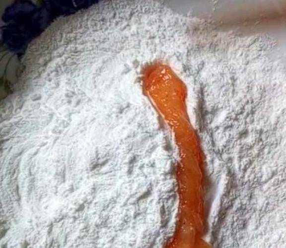 准备一个盘子,里面放上一半的面粉和一半的淀粉拌均匀,然后把鸡肉条裹上一层粉。