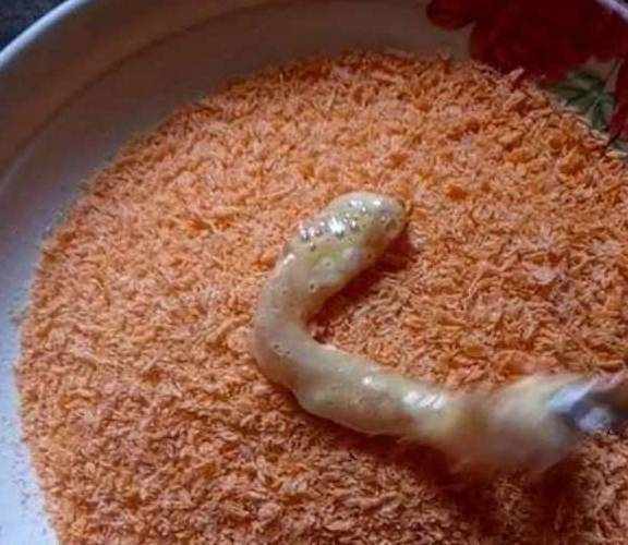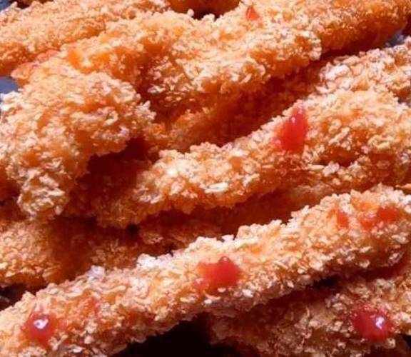 炸熟了之后捞出来放到盘中,沾一点的番茄酱就可以吃了。