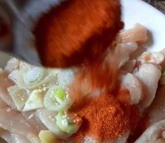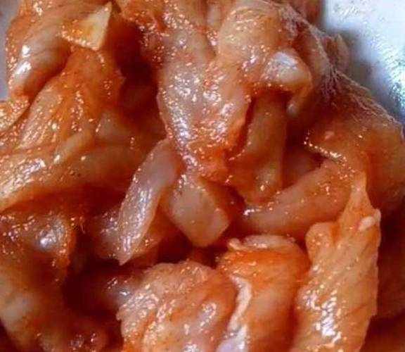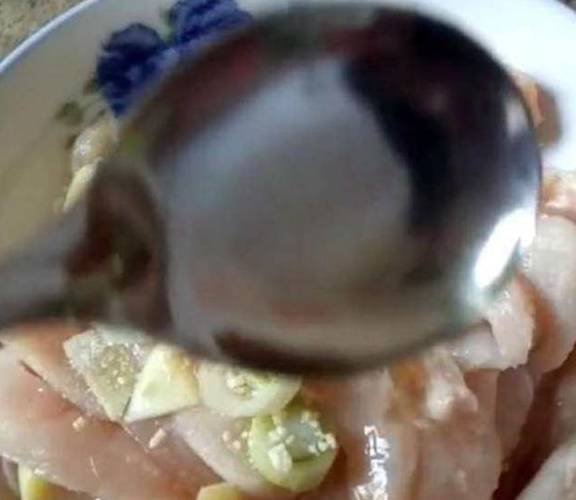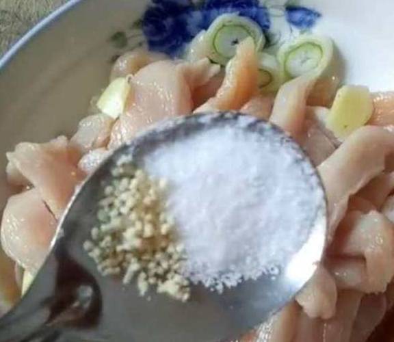 把鸡肉条放到一个碗里,加入葱姜、盐和鸡精拌均匀。