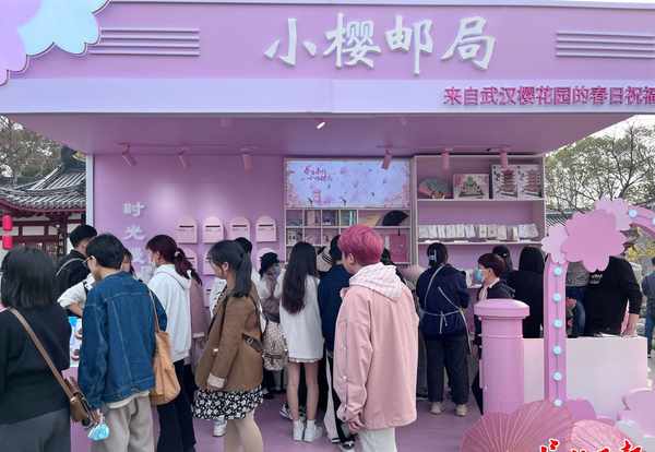 樱花蕾丝手工皂、樱花园钥匙扣、五重塔发光棒棒糖……曲院樱艳旁,樱花集市和小樱邮局吸引了大量外地游客。“东湖太美了!女儿在成都工作,平时聚少离多,看到美景总想分享给她。”游客王日升购买了樱花香薰、樱花扇子等文创礼品后,还在小樱邮局投递了一封给女儿的春日祝福。
