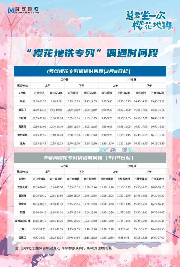 武汉轨道交通1号线和8号线在3月8日同步上线了“樱花地铁专列”,并一直持续运营至4月30日。大家可根据已公布的站点专列停靠时间段乘坐“樱花地铁专列”去武汉大学赏樱啦。