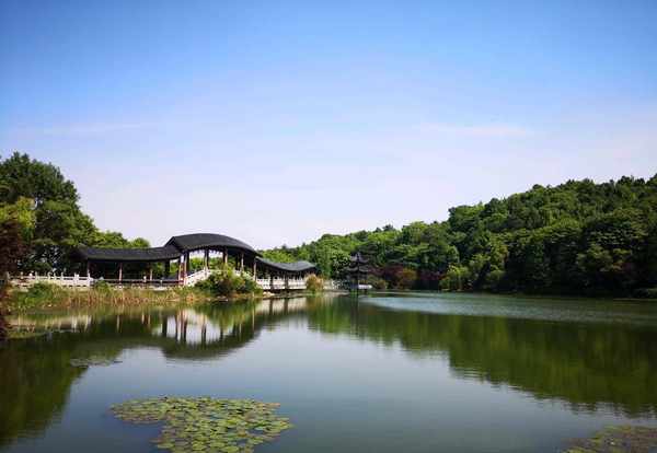 在山顶休息一阵,待体能恢复,又精神抖擞的继续前行。走完大约200米的平地,就迎来平缓的下坡路。路仍然有两车道宽,不时有载满游客的旅游车从身边越过。行走大约半小时,半山腰处,眼前忽然出现一片湖水!令人特别惊喜!岳麓山上居然有一面湖!毕竟,山上有湖比较少见。百度一下,原来这面湖还有个名字,叫穿石坡湖,湖名来源于一个美丽的传说。相传西晋时期,陶侃射杀蟒妖后,遵照白鹤姑娘的遗愿,相约在50年后再相见。耄耋之年的陶侃因政务耽误了相约之期。陶侃在相约之处苦苦守候了九九八十一天,精诚所至,终得以见。菩萨为阻断白鹤姑娘再生思凡之情,便叫陶侃从石门离去,陶侃被迫穿石而出,转身仅见一堵石壁矗立在眼前。故而称之穿石坡。