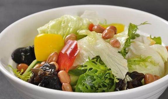 材料:圆生菜3片、黄瓜1根、紫甘蓝3片、甜玉米30克、油炸花生豆30克、苦菊30克、香叶1片、香菜1根、鲜味生抽40ml、苹果醋40ml、白糖30克、清水40ml、香葱1根