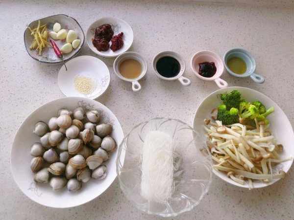 配料:花甲200克,姜蒜适量,生抽两勺,郫县豆瓣酱适量,黄豆酱适量,冰糖一把,蚝油两勺,料酒一勺,鸡精少许,香油少许,小米椒两个,金针菇适量,粉丝一把。