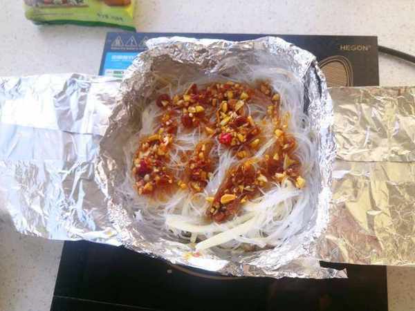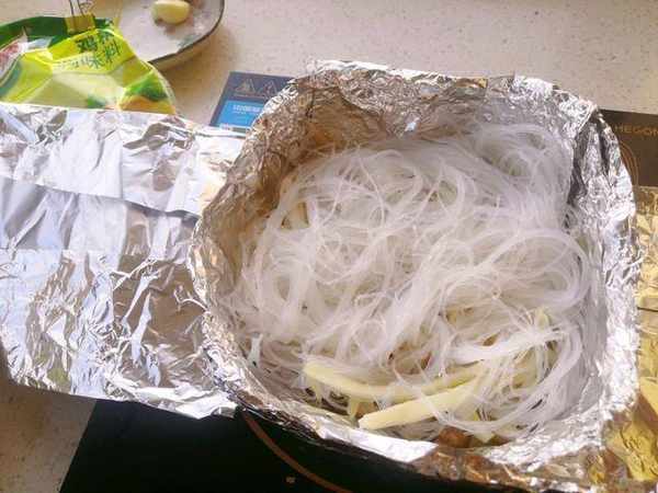 步骤四:金针菇可以用水焯一下,然后铺在锡纸的底部,然后上面把泡软的粉丝给扑上去。