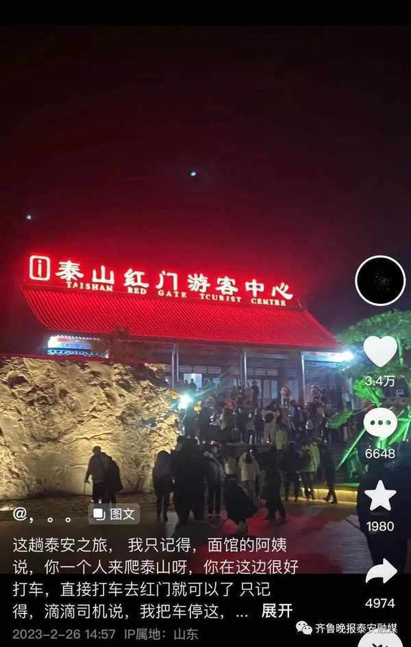 “这次泰安之旅,我只记得,面馆的阿姨说,你一个人来爬泰山呀,你在这边很好打车,直接打车去红门就可以了;只记得,滴滴司机说,我把车停这,你去买手电、登山杖还有祈福牌,在这买便宜,只记得在楼梯上休息的时候,一位阿姨说,小美女休息呢,继续加油,快到了……”2月26日,一名来自安徽的女生在夜爬泰山之后,在自己的社交媒体上发布了500字感言,并配图记录自己在泰山上的美好回忆。