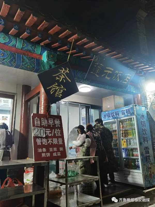 在日出之后,为了给游客递上一碗“清晨的粥”,不少餐厅直接打出了20元管饱的牌子,只需20元,馒头、油条、煎饼、小咸菜、豆浆、粥,能吃多少吃多少。厨房内热油翻滚,片刻油条上桌,再配上豆浆、小咸菜,成为不少游客度过泰山一夜后的首选。
