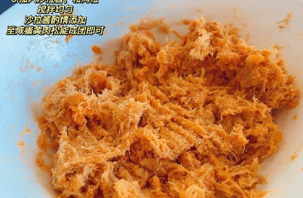步骤三:加入沙拉酱和肉松,搅拌均匀。