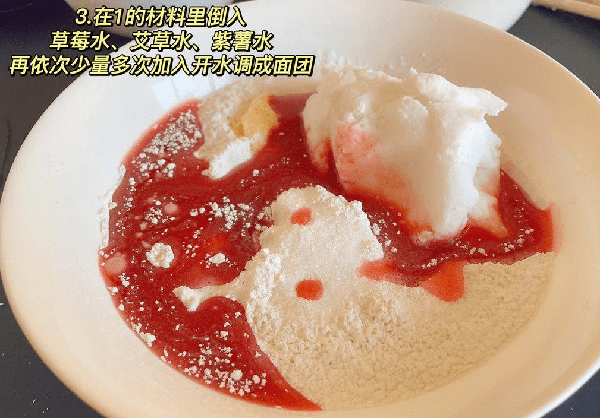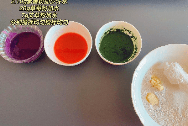 步骤五:我做了三种皮,如果做一种就是以上材料,做三种,除以上材料不同,其余一样。艾草粉加入少许水,搅拌均匀。