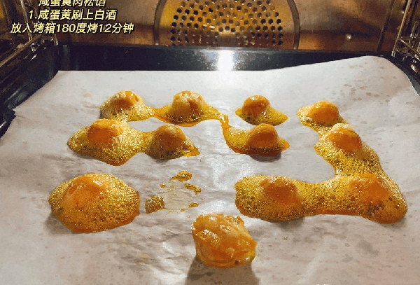 步骤一:准备食材:糯米粉150克,澄粉45克,糖10克,肉松120克,沙拉酱85克,黄油15克,艾草粉7克,咸蛋黄12个。12个咸蛋黄刷上白酒,放入180度烤箱烤12分钟。