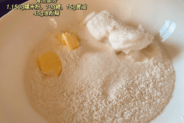 步骤四:澄粉加入适量开水,搅拌均匀成团,碗里放入糯米粉,糖,黄油,澄粉团。