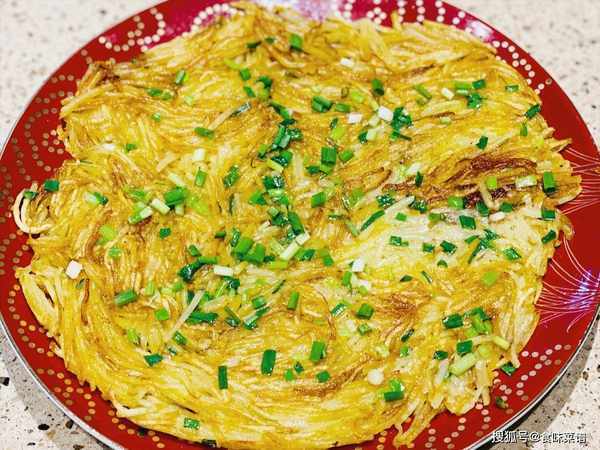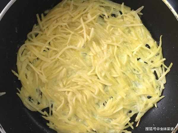 2、土豆丝中加入少许的食盐调味,起锅烧油,油热舀入土豆丝糊,平摊均匀,用中小火加热,因为有淀粉的存在,土豆丝很快就会成型,煎至色泽金黄,翻到另外一面。