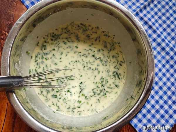 1、准备一把鲜嫩的韭菜,清洗干净,控干水分,切成碎末,盘中加入少许的面粉,少量多次的加入清水,搅成细腻的面糊。