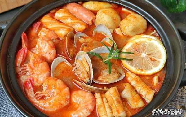 食材:冬阴功酱,虾,鱿鱼,花甲,白玉菇,火锅丸子,番茄,椰汁