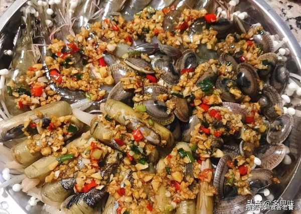 大虾、花甲、蛏子、金针菇、蒜蓉、小辣椒、葱花、油、盐、酱油