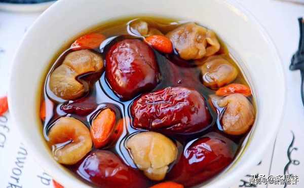 材料:桂圆15克、红枣8粒、枸杞15克、红糖15克