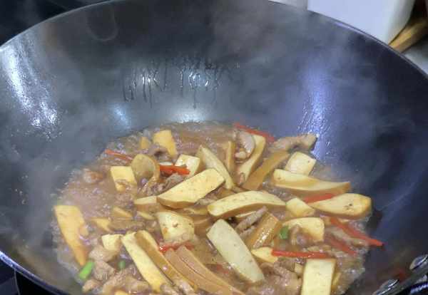 步骤3:加葱姜蒜末煸香,然后加入香干,加1勺酱油、半勺老抽、1勺料酒和少许清水,大火烧开,煮2分钟。