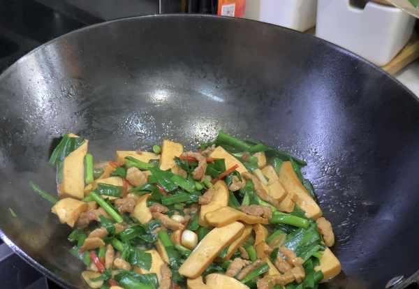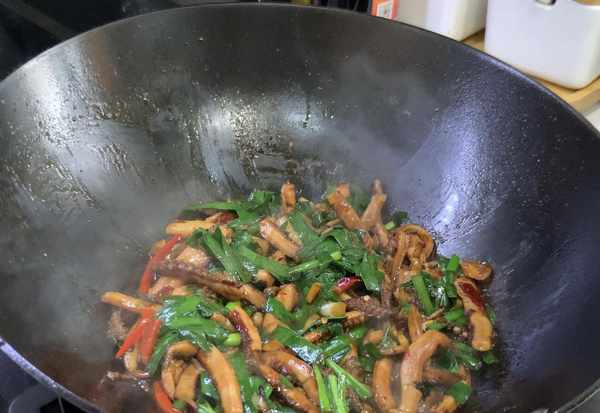 步骤5:最后加韭菜翻炒片刻,就可以出锅了。