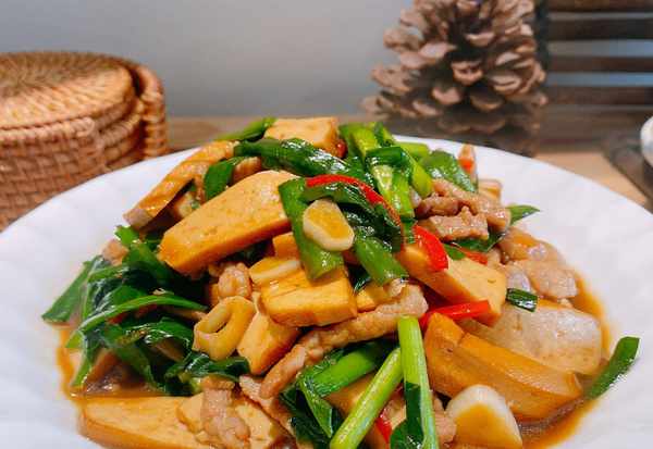 食材:韭菜、香干、肉丝、葱姜蒜、红辣椒、酱油、老抽、料酒、盐、淀粉、食用油。