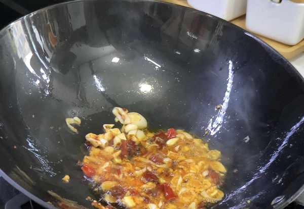 步骤3:起锅烧油,加些葱姜蒜末煸香,再加1勺豆瓣酱炒出红油。