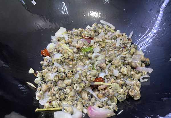 步骤2:起锅烧油,放入葱姜蒜和辣椒煸香,再放入螺肉煸炒片刻。