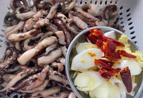 步骤1:韭菜洗干净切段,葱姜蒜切末。然后把鱿鱼触角洗干净,沥干水分备用。