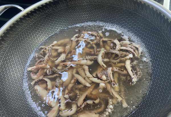 步骤2:起锅烧水,加些料酒,放入鱿鱼触手焯水,煮2分钟捞出,沥干水分备用。
