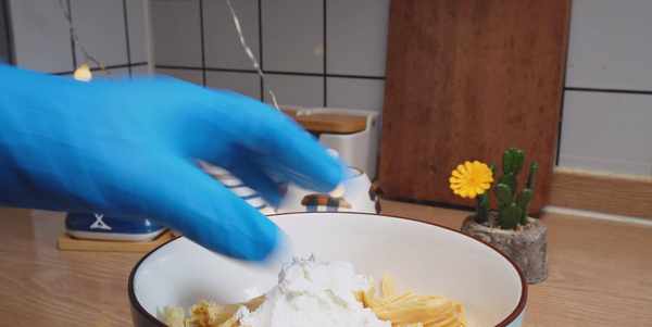2、然后再加入一个鸡蛋,加入鸡蛋会让辅助吃起来更加的脆,然后再次加入两勺的玉米淀粉,这样会让腐竹吃起来更加的脆口,再次给它抓拌均匀,最后抓拌成这个样子就可以了。