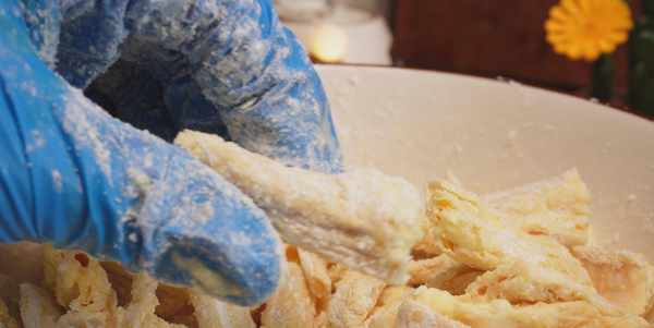 1、泡软的腐竹,把里面的水分挤干,然后加入一勺盐,入一个底味,用手抓一下,然后加入两大勺的玉米淀粉,再次用手抓一下,一定要给它抓拌均匀,这个可是腐竹好吃的关键,让每一个腐竹上都裹上玉米淀粉,这样才更加好吃。