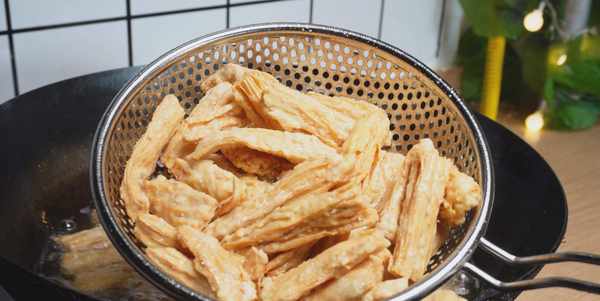 4、油温5成热,逐个把腐竹下入油锅炸一下,刚下锅的腐竹不要搅动,等腐竹定型以后再用照例轻轻的搅动一下,让其受热均匀,然后就这样一边炸一边搅动,炸到腐竹吃,听起来声音比较脆,颜色比较金黄,像这个样子就可以捞出放入滤网中过滤一下油。