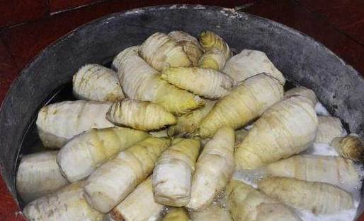 2、春笋剥好切成片,在开水中焯3分钟。