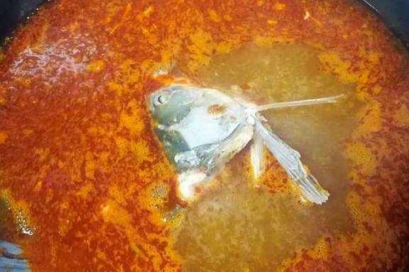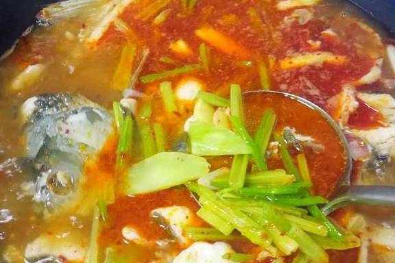 5、锅内放少许油,煸炒芹菜和莴笋片,盛出,加入适量开水,放入水煮鱼汤料烧开,放入鱼头煮2分钟;
