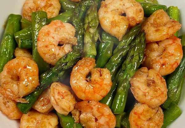 3、起锅烧油,油热后放入腌制好的虾仁翻炒,炒至变色后放入芦笋翻炒均匀。
