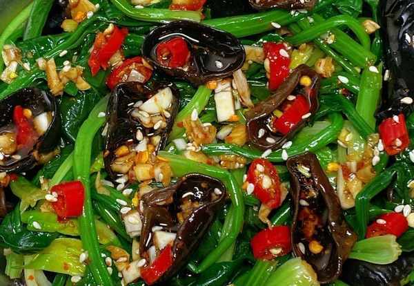 准备食材:菠菜,黑木耳,蒜末,小米辣,辣椒面,白芝麻。