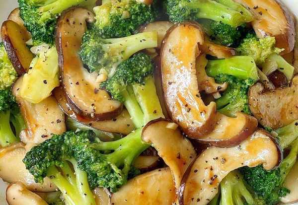3、香菇清洗干净切成片,蒜切成蒜末。起锅烧油,油热后放入蒜末爆香,再放入香菇翻炒一会儿,炒软后放入西兰花翻炒均匀。
