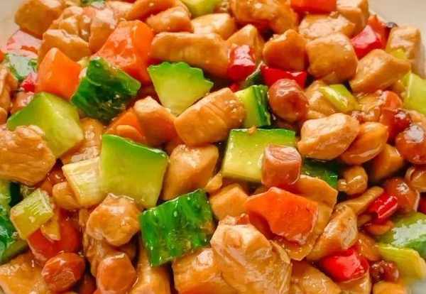 6、接着倒入提前备好的宫保汁,翻炒均匀,煮至浓稠后倒入提前虾好的花生米,翻炒均匀即可出锅装盘开吃。