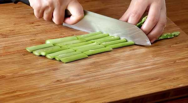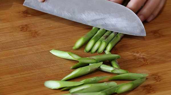 1、我们买到的芦笋一般都是一整根的,回来先不用切,给它洗洗干净,然后再斜刀切成小段;