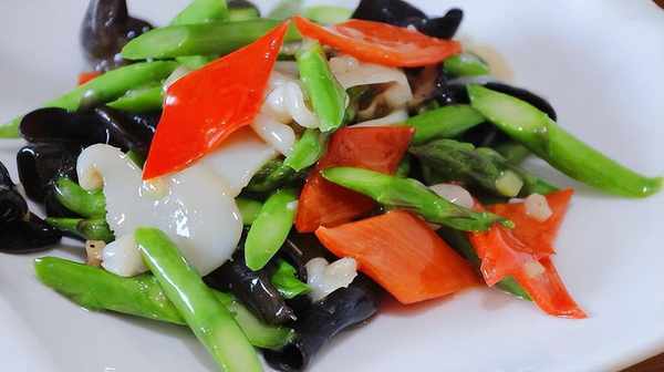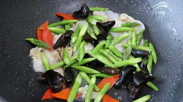 所需食材:芦笋,带子肉,木耳,红椒;
