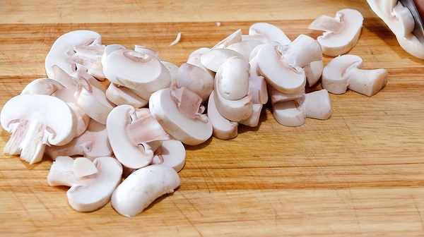 3、口蘑上都是有黑黑的泥土,把这个根部削掉,清洗干净就可以了,再给它切成厚厚的片,这样吃起来口感会更好一些;